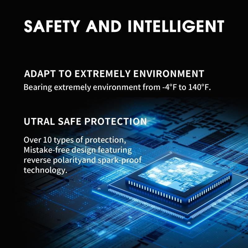 【10 Protection intelligente et fonctionnement stable】 : Notre démarreur de démarrage de voiture a 10 systèmes de protection (polarité inversée, charge inversée, décharge excessive, connexion inversée, court-circuit, surcharge, surintensité, surchauffe, résistance aux étincelles). Le pack de démarrage haute puissance pour batterie de voiture assure votre sécurité pendant l'utilisation et le pack de démarrage peut fonctionner dans -22°F ~ 140°F, même dans n'importe quel temps extrême.