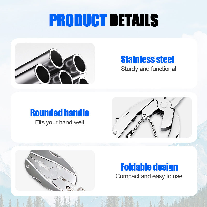 OUTIL MULTIFONCTIONNEL : Comprend une pince, un coupe-fil, un tournevis cruciforme, un tournevis plat, une lime, un couteau, un ouvre-boîte et un décapsuleur, adapté aux réparations quotidiennes, aux activités de plein air ou aux urgences.