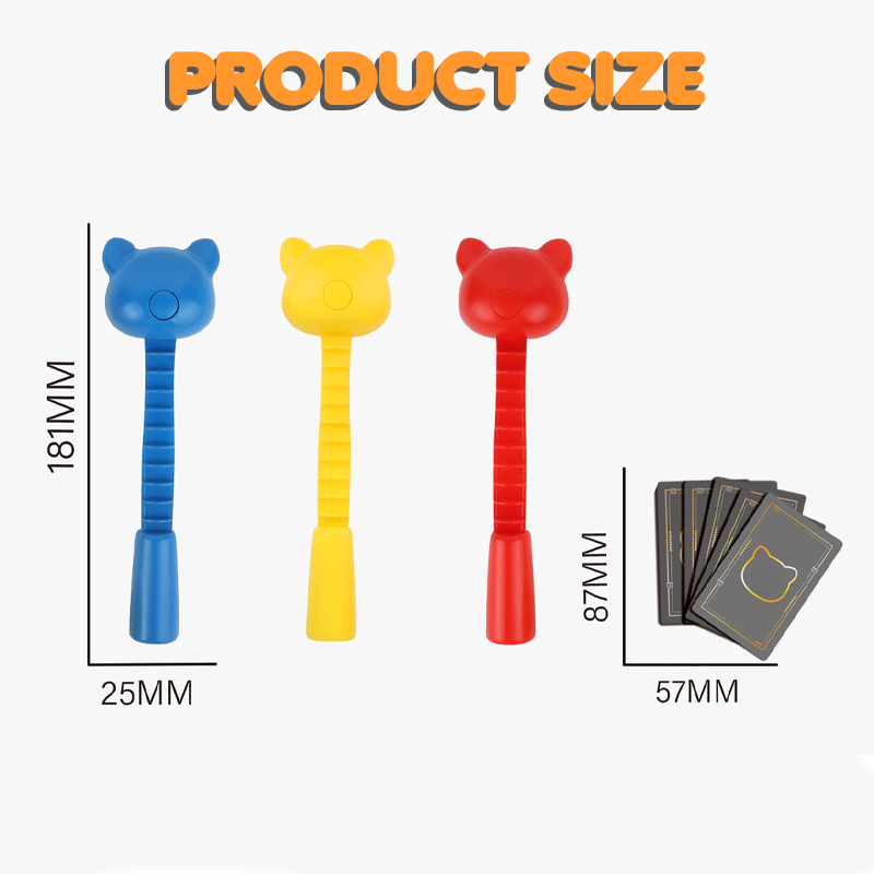 MARTEAUX À VENTOUSE UNIQUES : Chaque joueur manie un marteau en forme de patte de chat muni d'une ventouse. Ce mécanisme amusant exige rapidité et précision pour attraper la bonne carte, ajoutant ainsi un élément physique palpitant et satisfaisant au jeu.
