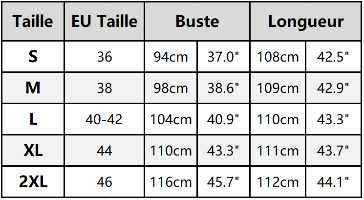 Taille : S, M, L, XL, 2XL.