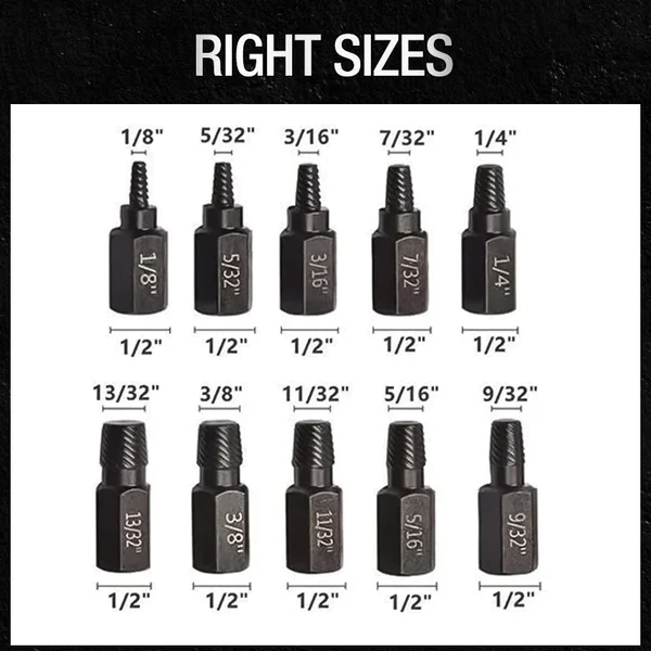 ➤ Les bonnes tailles - Il faut toujours avoir le bon embout d'extracteur lorsqu'il faut s'occuper de vis cassées ou gelées. Cet ensemble comprend des extracteurs de 1/8" à 7/8", et chaque pièce porte une marque gravée au laser pour une identification facile.